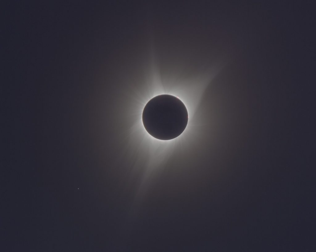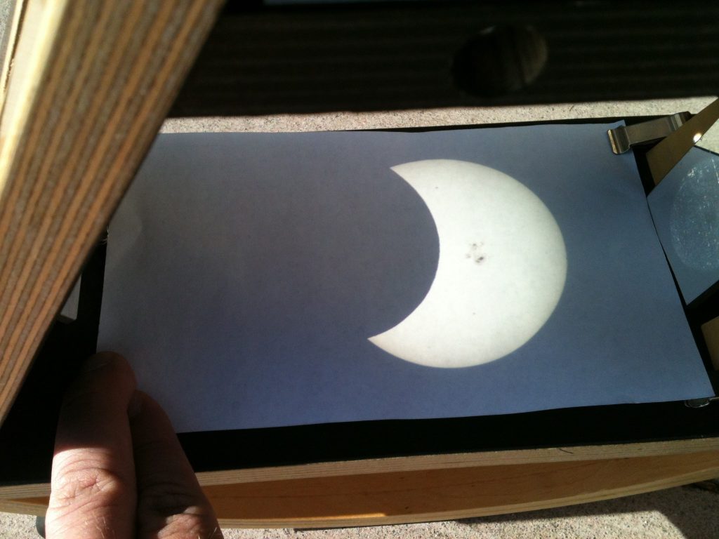 A wonderful way to view the Sun during a partial eclipse is to project its image. The simplest way to do this is with a pinhole projector. This can be as simple as a piece of cardboard with a tiny hole in it. It can even be your hands with the fingers criss-crossing to let tiny bits of light through. The image projected through the tiny holes is in fact the Sun. During the partial eclipse, you will see the shape of the projected image become a crescent shape as some of the Sun’s disk is blocked by the Moon.