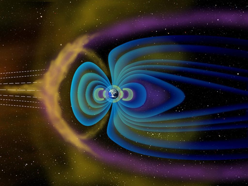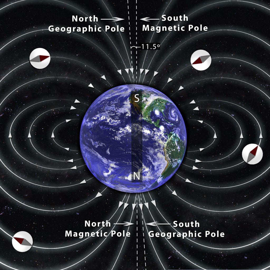 Earth’s magnetic field is generated by electrical currents in its molten iron core. The shape of the magnetic field is similar to that of a bar magnet, with the magnetic poles closely aligned to the spin axis of the planet. The field strength weakens with distance from the core.